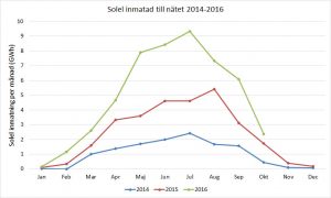 Solel inmatad till nätet per månad under åren 2014-2016. Data från Svenska Kraftnäts statistik.
